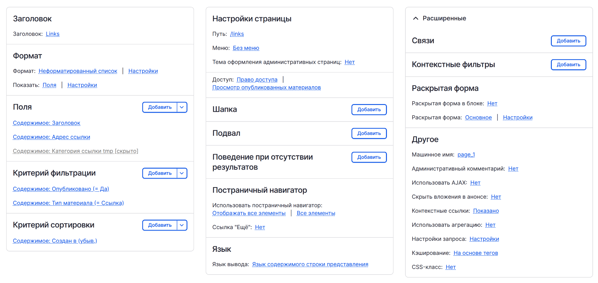 Настроиваем нужные для отображения поля (заголовок ноды, ссылка и т.д.).
