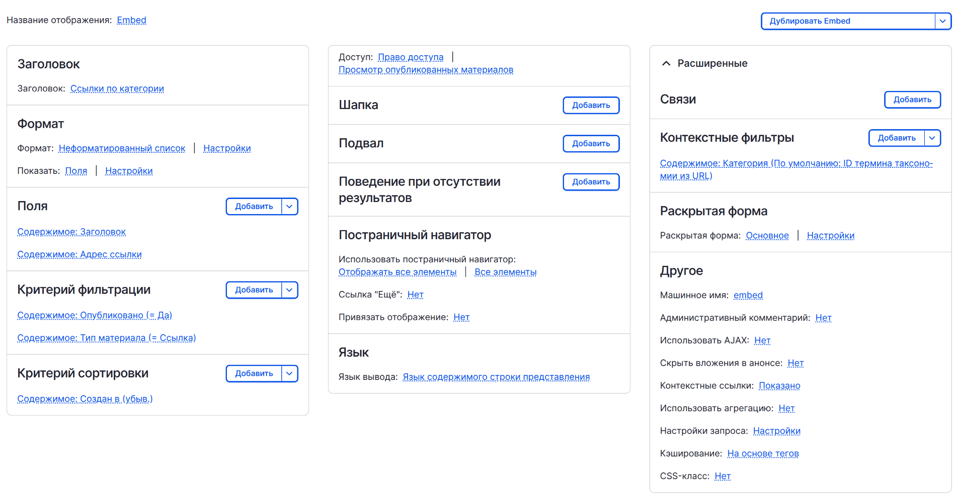 Отображение - если сразу выставить Embed друпал выдаст ошибку. Оставляем default.