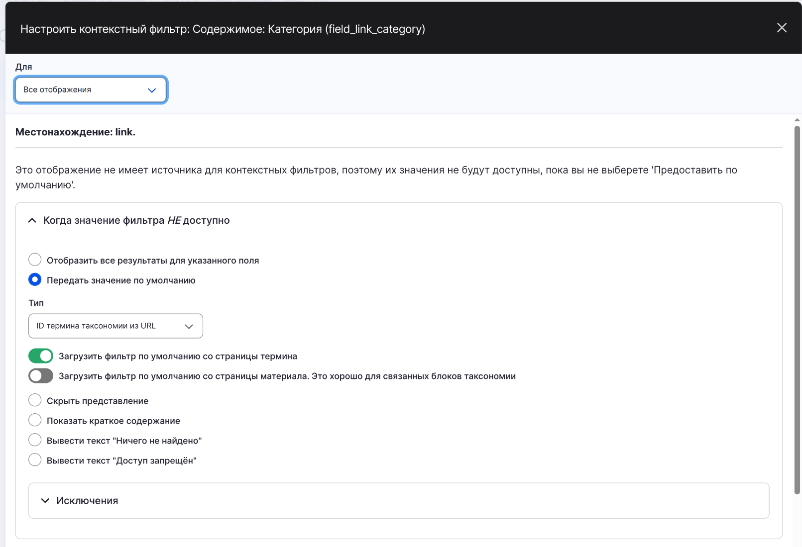 В настройках фильтра выбираем: «Provide default value» -> «Taxonomy term ID from URL» (хотя передавать мы его будем вручную).